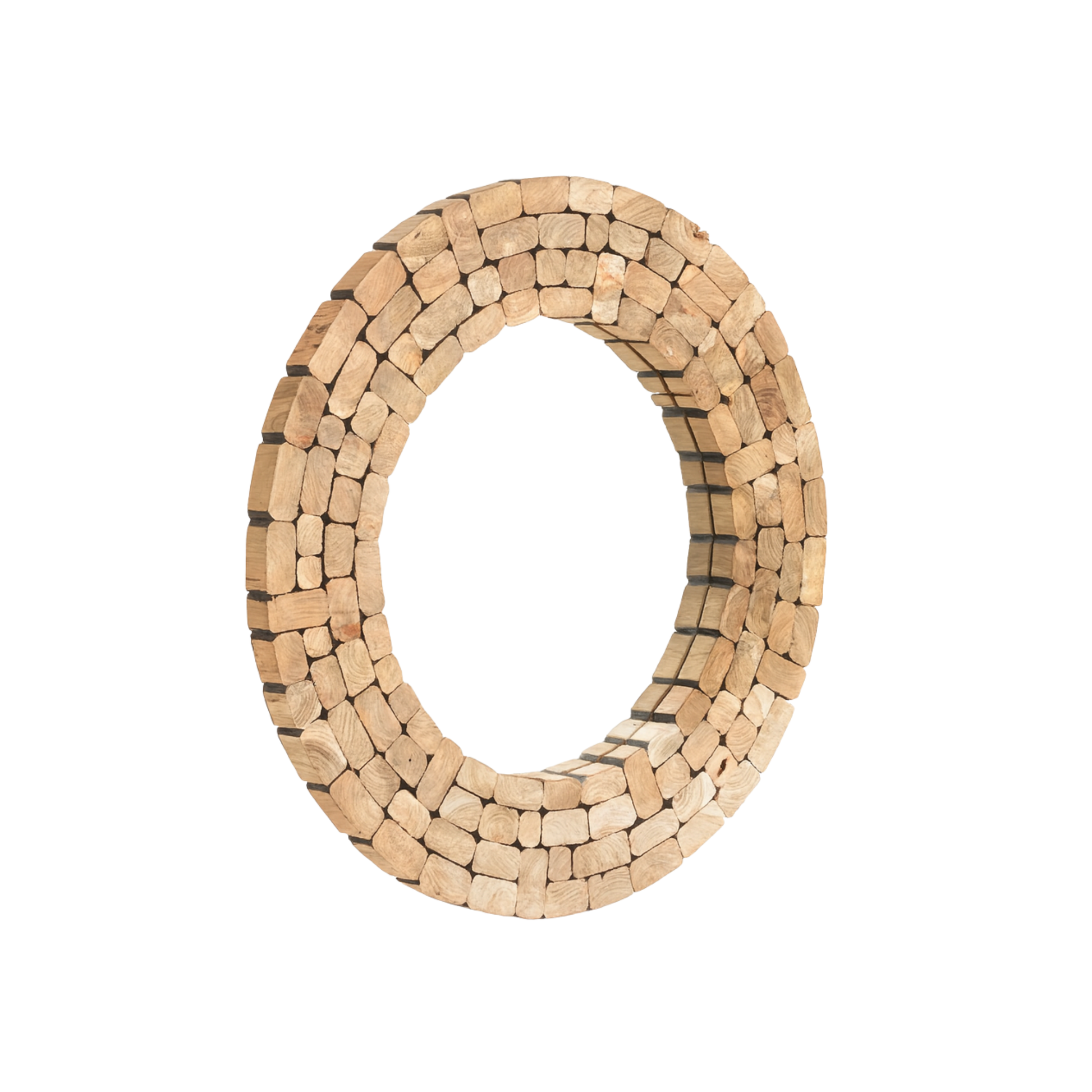 El espejo Eliptic tiene un marco de piezas talladas de madera maciza de teca natural, colocadas manualmente una a una. Cuando unes sostenibilidad y diseño pasan cosas increíbles.